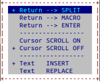 Return –> MACRO | Return führt das MACRO mit dem Namen »CR« aus, falls der Cursor im Textfeld steht. Falls der Cursor in der Anweisungszeile steht, wird das MACRO mit den Namen »CMD« ausgeführt. Falls die MACROS nicht definiert sind, hat Return die gleiche Wirkung wie im Modus SPLIT. |
